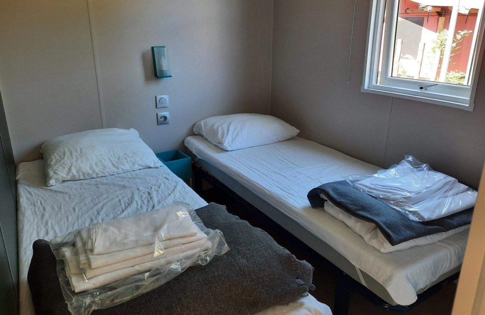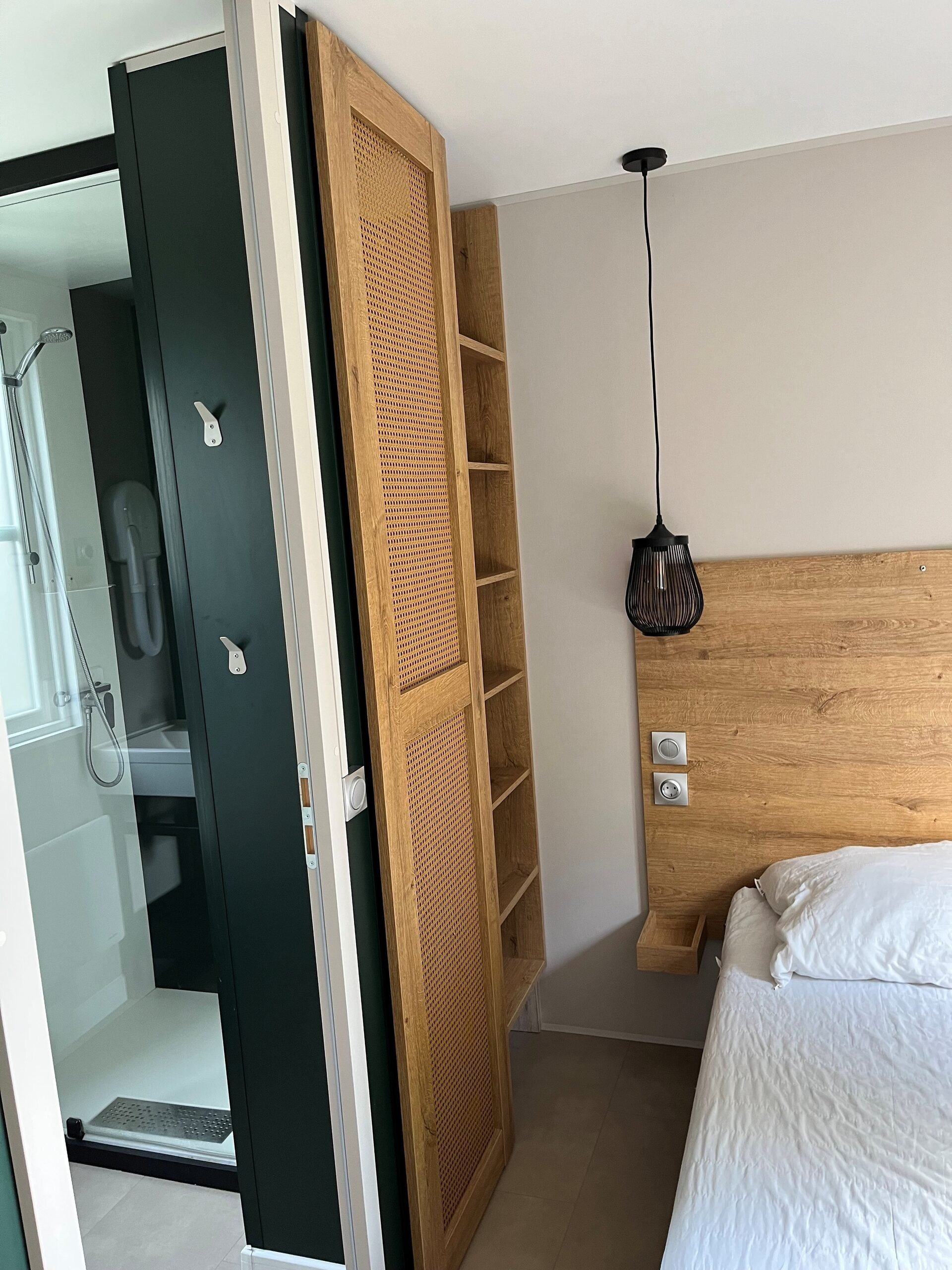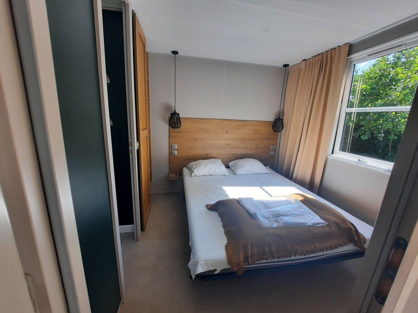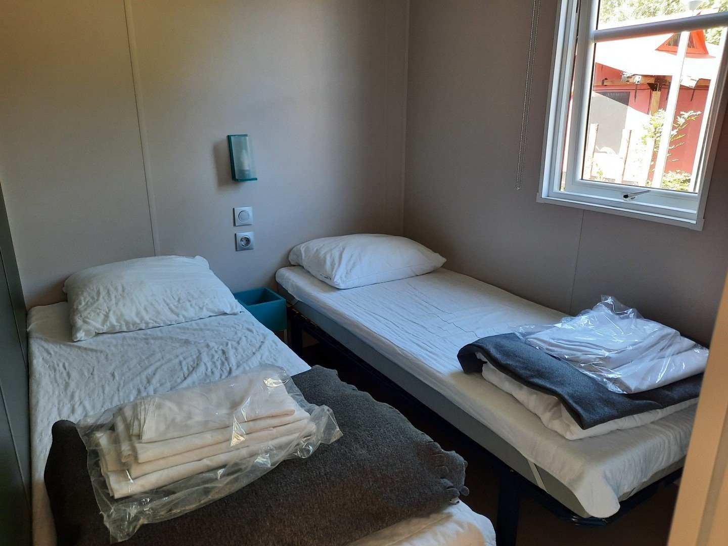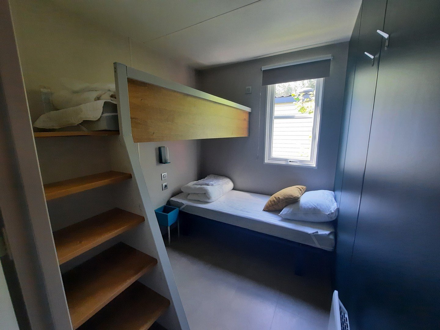 - Drei Schlafzimmer: ein Schlafzimmer mit Doppelbett, ein Schlafzimmer mit zwei Einzelbetten und ein Schlafzimmer mit Etagenbett. Jedes Schlafzimmer hat einen Kleiderschrank.