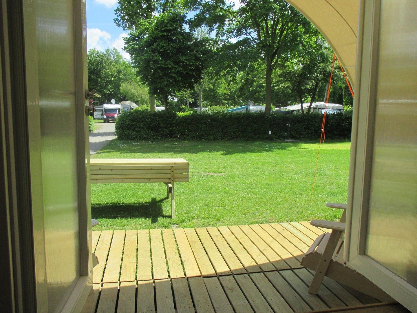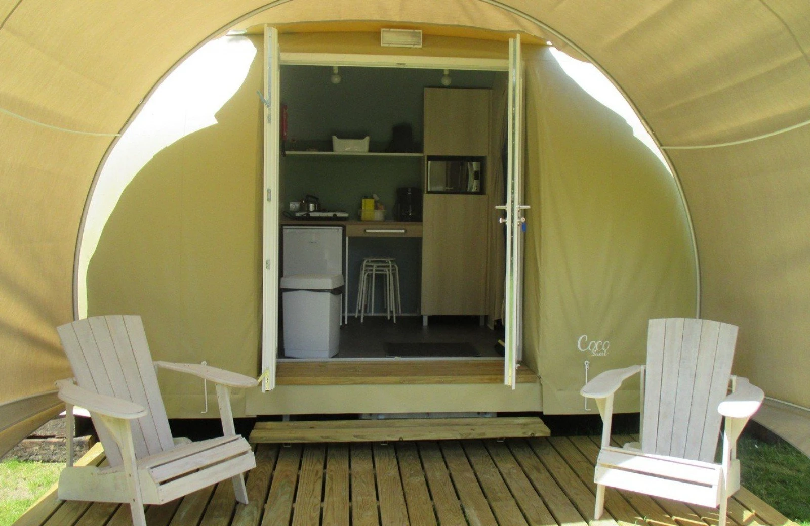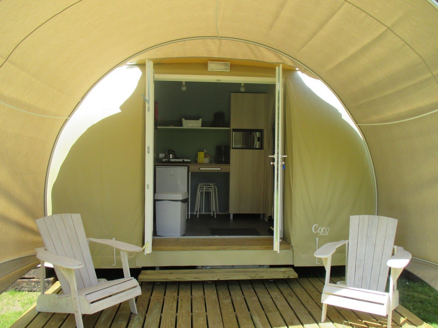 Für abenteuerlustige und sportliche Camper, die kein Zelt mitbringen: Das Coco steht bei Ihrer Ankunft bereits vollständig aufgebaut bereit. Kein Schleppen von Zeltstangen oder Heringen, einfach einsteigen und einen fertigen Campingurlaub genießen.